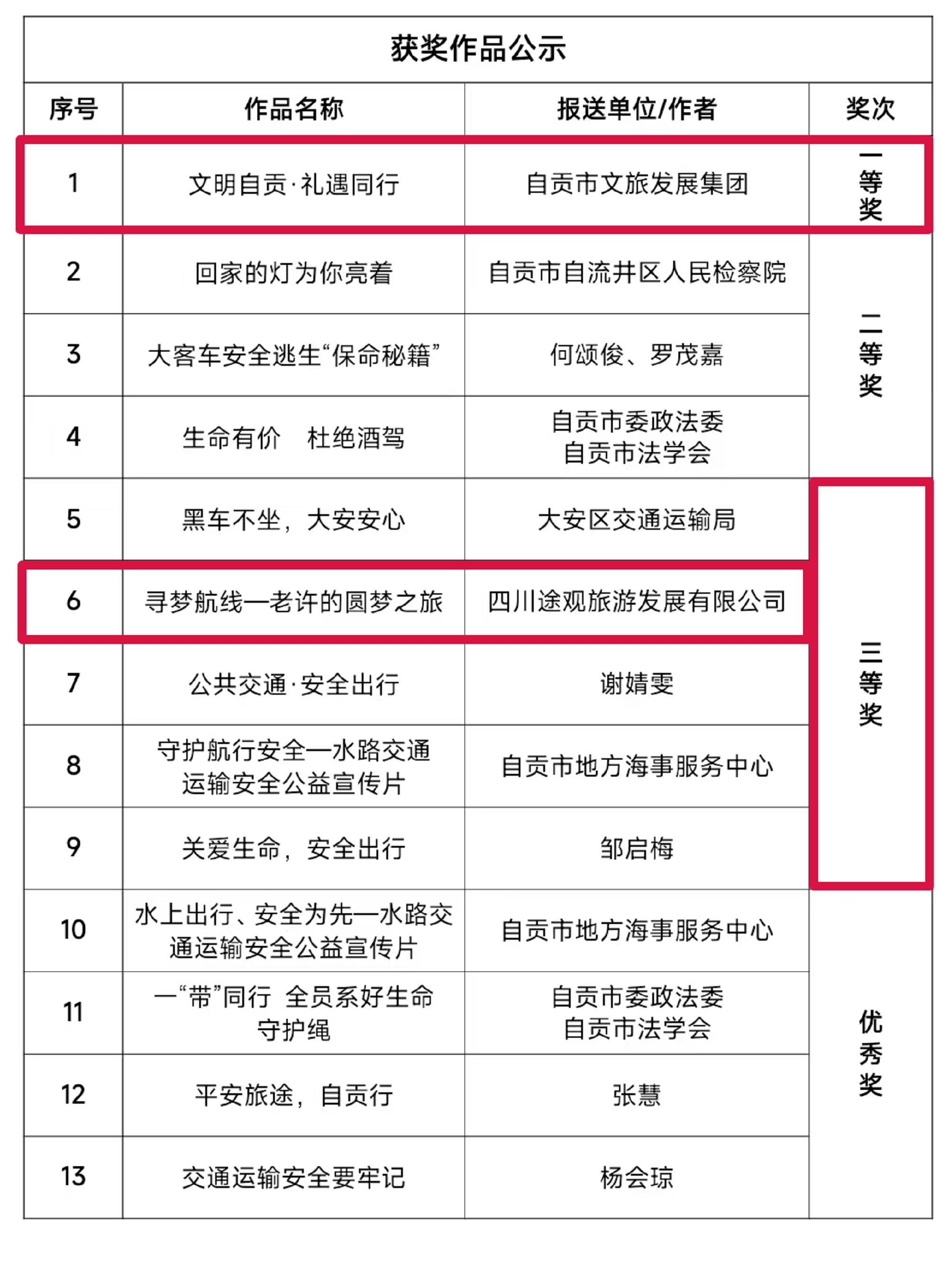 自貢市交通運輸局“交通運輸安全公益短視頻”大賽評選結果正式揭曉。市文旅發(fā)展集團精心拍攝制作的公益視頻《文明自貢·禮遇同行》憑借貼合主題的內容呈現與細膩的創(chuàng)作表達,榮獲大賽一等獎;集團旗下四川途觀旅游發(fā)展公司的參賽作品《尋夢航線——老許的圓夢之旅》,以生動的敘事傳遞安全理念,收獲三等獎。